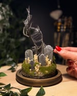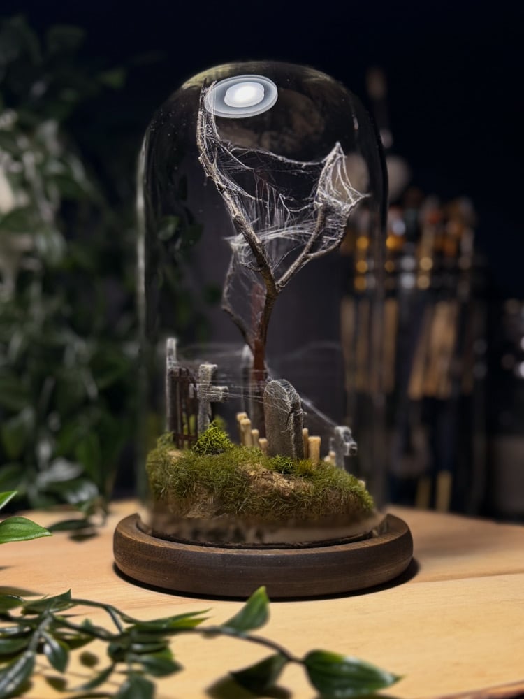 This piece is entirely scratch built by hand and encased in a glass cloche.
