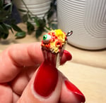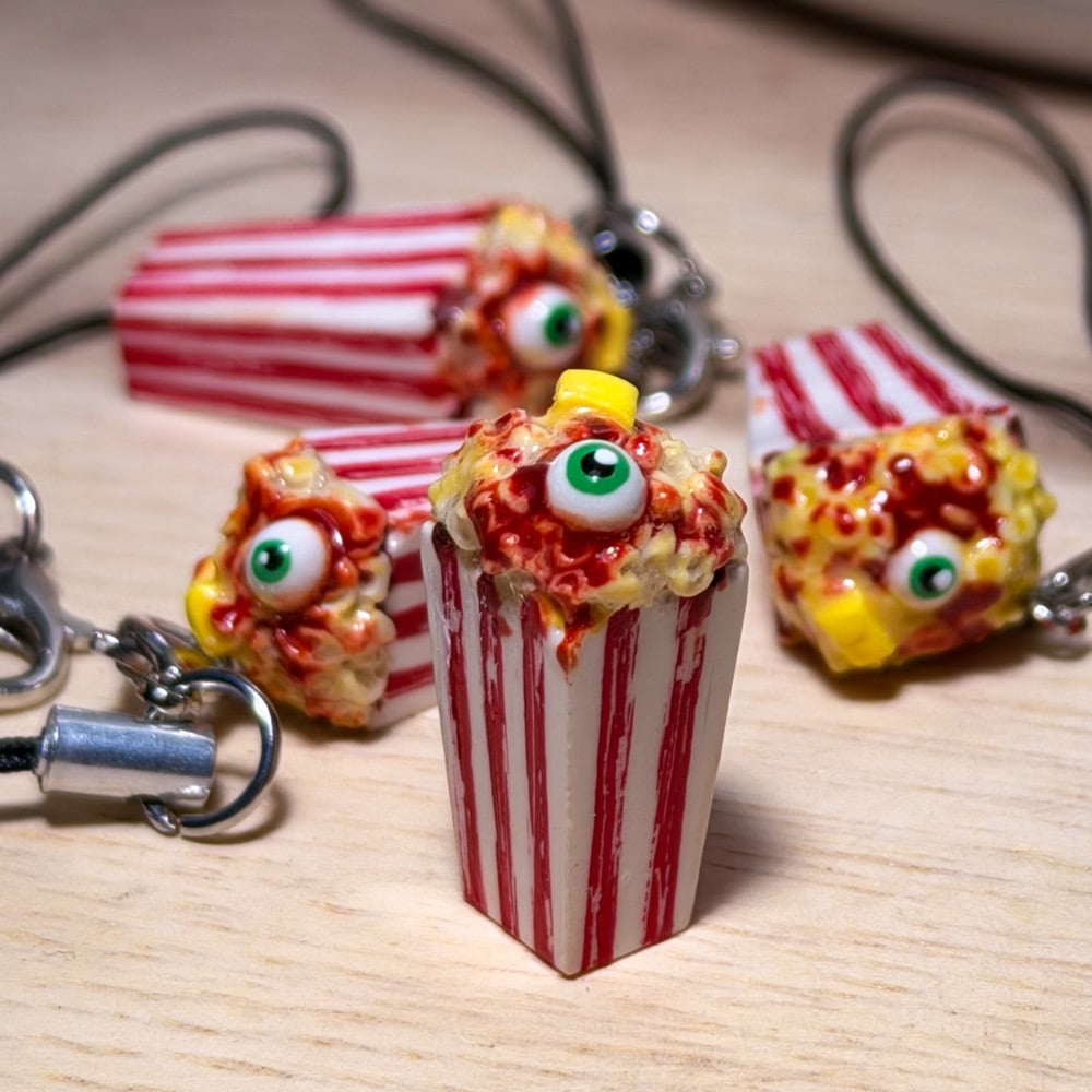 This miniature popcorn charm features an old school red and white striped bucket, buttery popcorn and a bloody eyeball for a spooky twist! Perfect for your phone, bag, or keys.